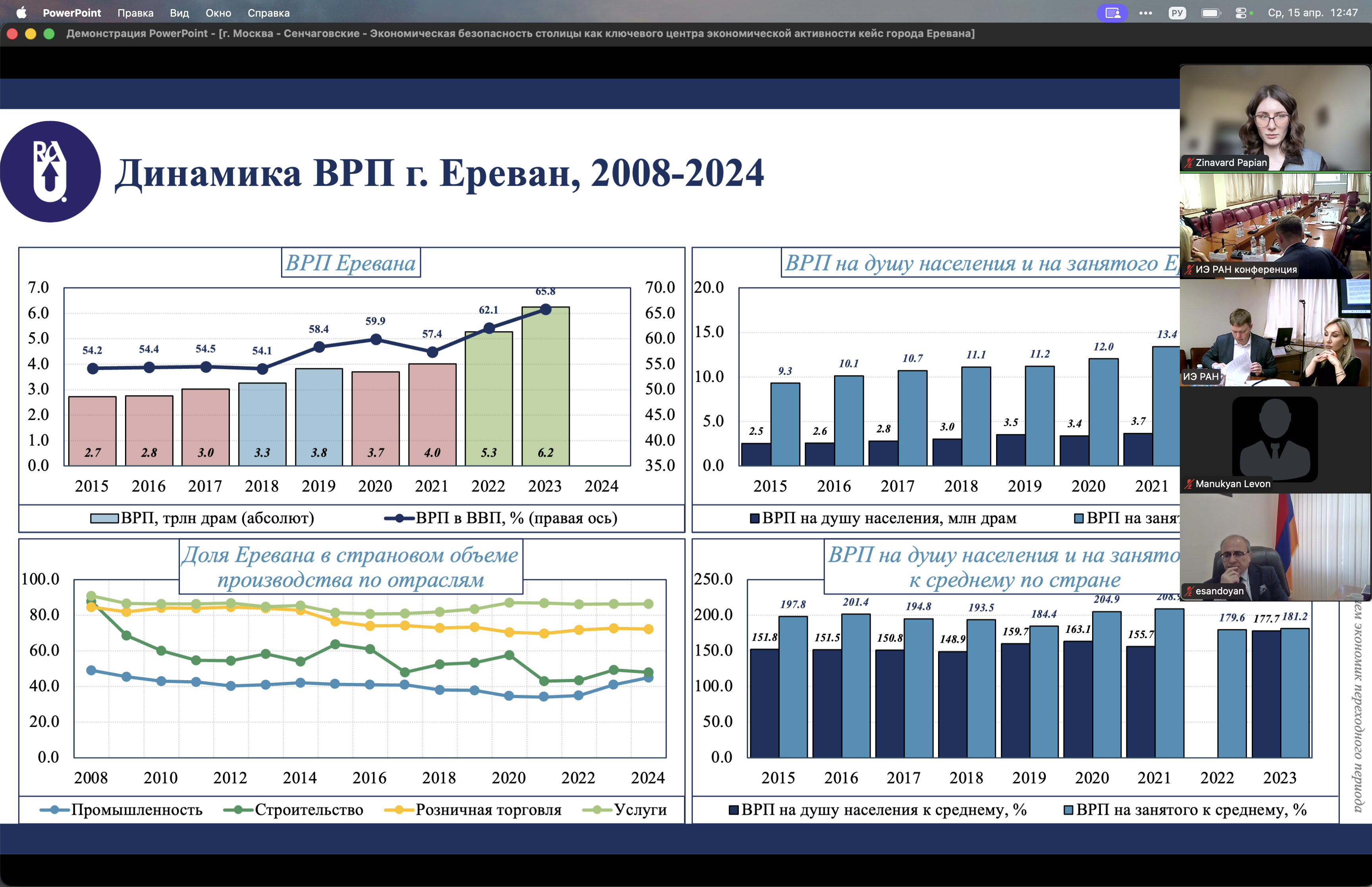 В общей сложности сотрудниками были представлены пять научных докладов, посвященных тематике экономической безопасности города Ереван, роли социального равенства и инклюизивного развития в обеспечении экономической безопасности, роли макроэкономической политки и диверсификации внешнеэкономичеких связей в обеспечении экономической безопасности